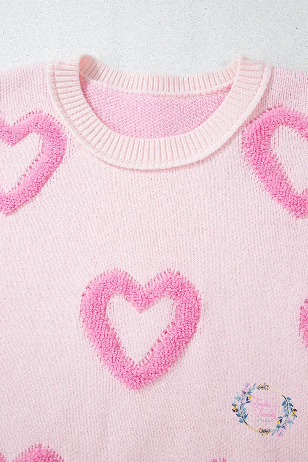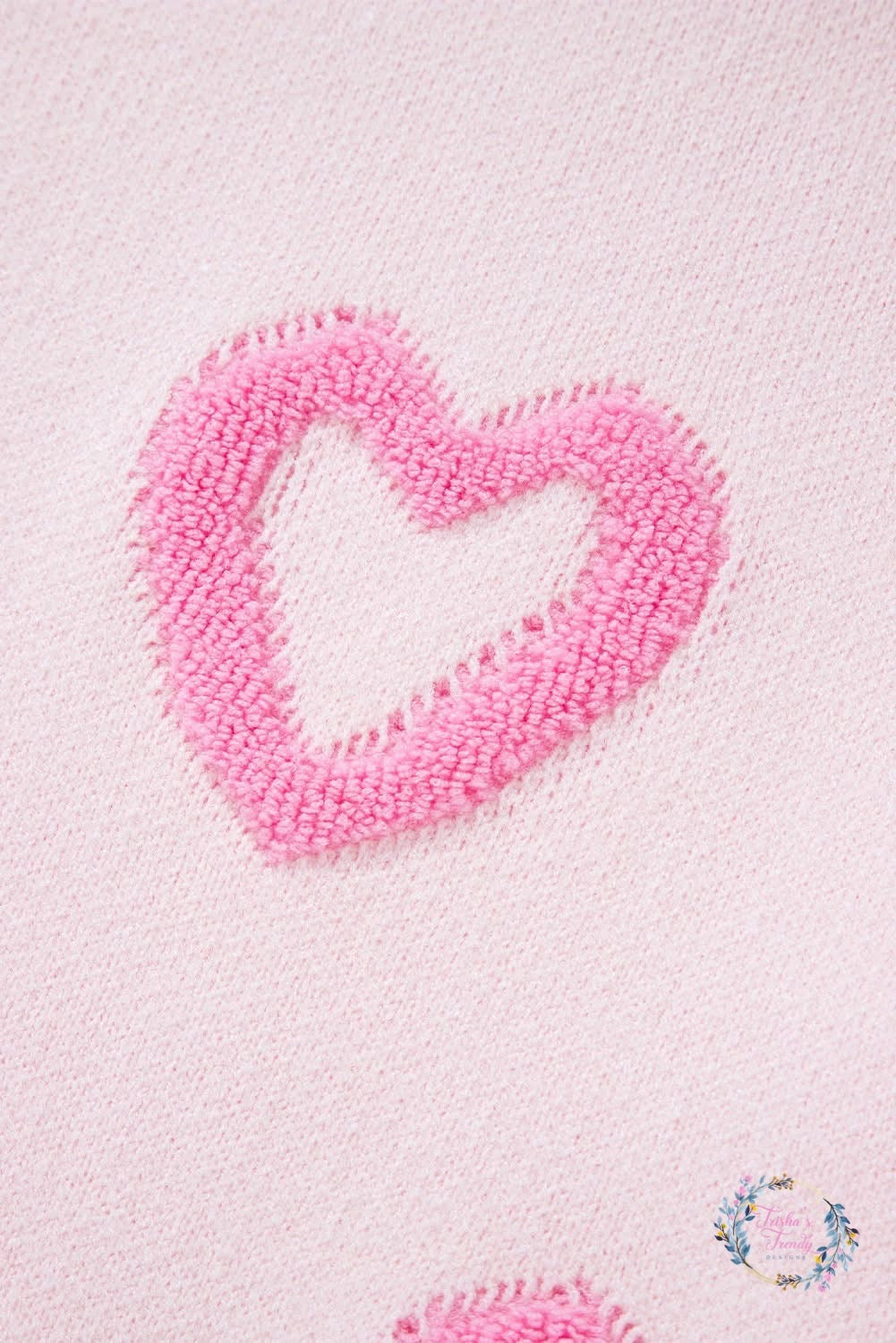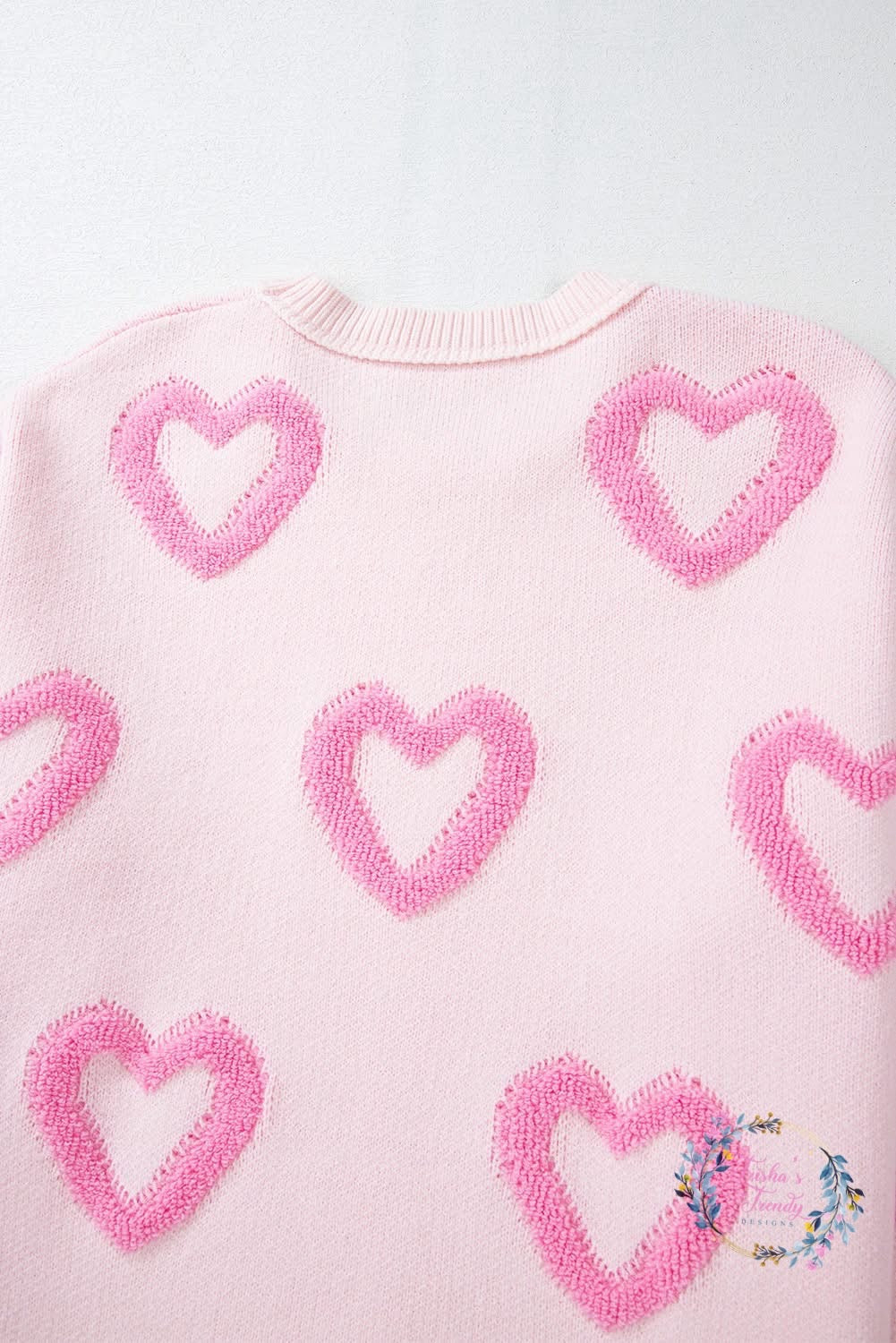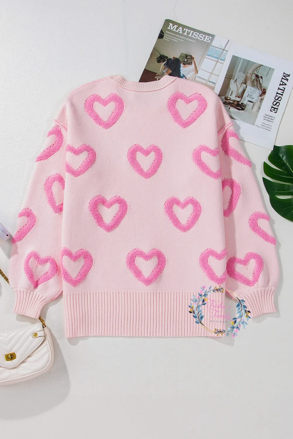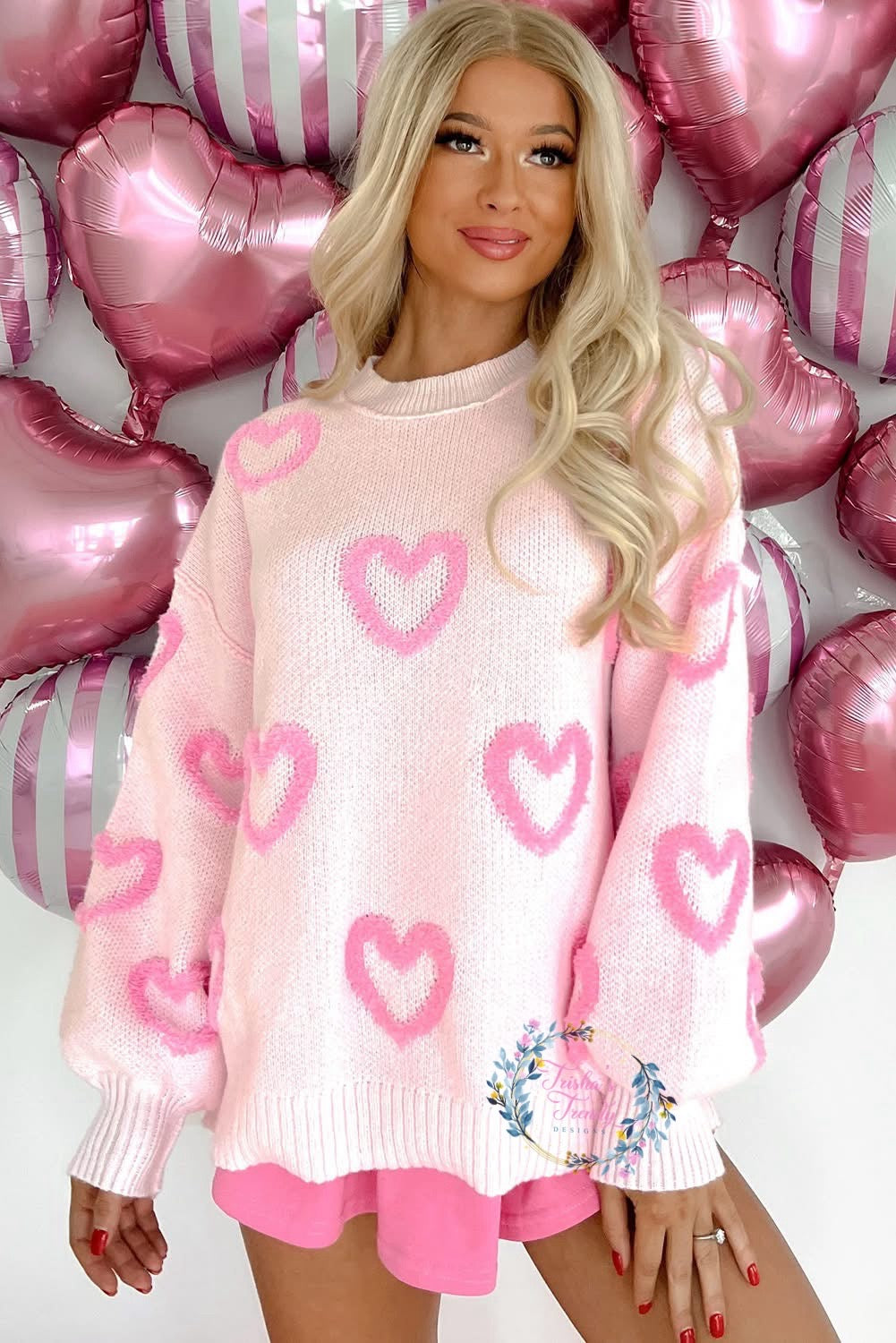 Fall head over heels for this adorable pink sweater, where scattered hearts dance across the fabric in pure sweetness. Snuggle-worthy softness meets playful style—it's the kind of cozy essential that makes you smile every time you slip it on. Secure yours now with preorder and get ready to spread the love!